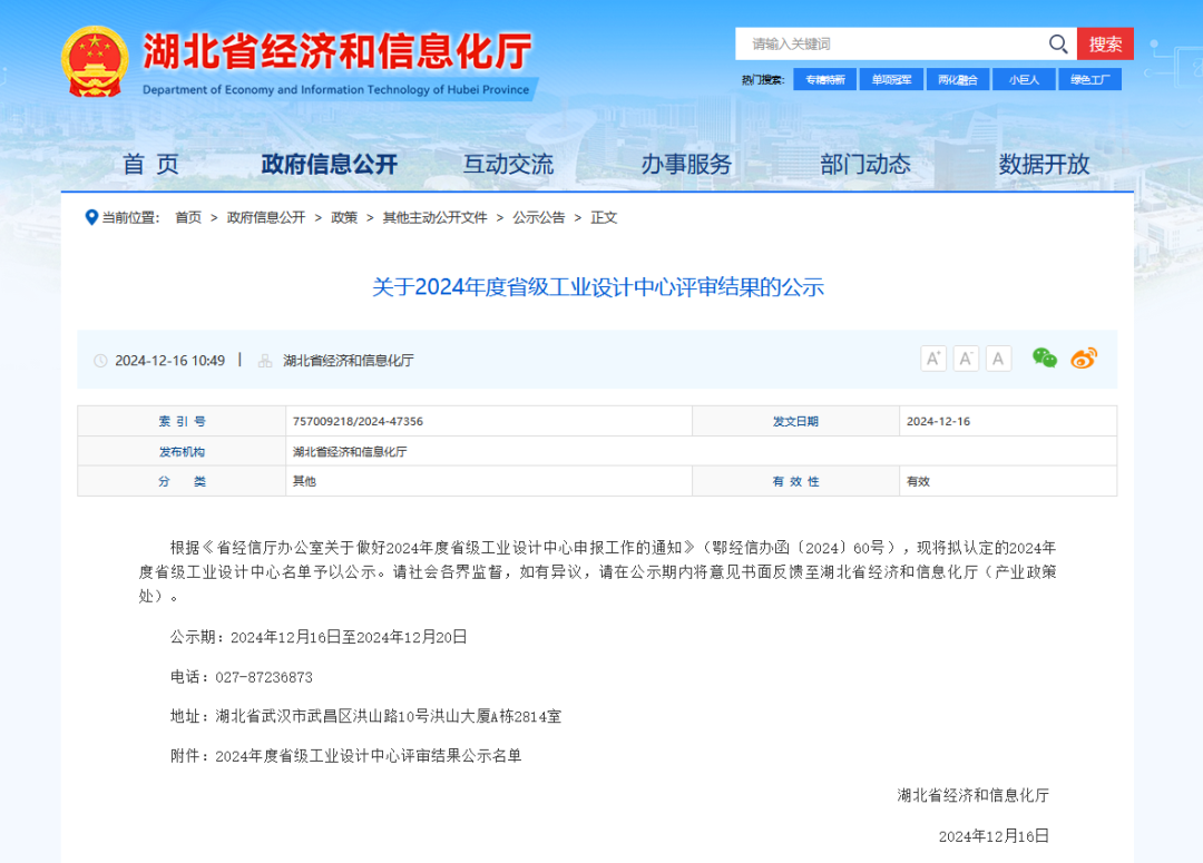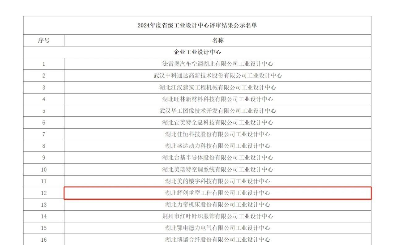 近日,湖北省经济和信息化厅发布了《关于2024年度省级工业设计中心评审结果的公示》,湖北辉创重型工程有限公司工业设计中心成功入选。这一荣誉不仅是对辉创重工科技创新实力的认可,更是对公司在工业设计领域卓越贡献的肯定。