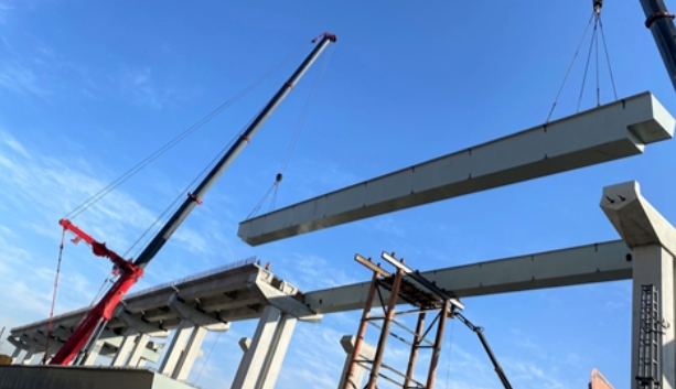 ✦将长45米的超大叠合梁一分为三,运输至现场进行二次拼装,再采用两台500吨汽车吊双机抬吊的方式,一次吊装到位;