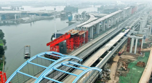 ✦跨横旦江、杭甬运河等大跨度节点采用顶推施工工艺,施工现场增加导梁及托架,方便箱梁顶推及定位。
