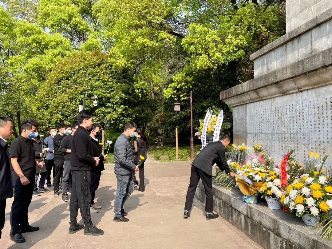 入园后,党员代表登上纪念碑台前向烈士敬献花篮,并仔细整理花篮绶带,全体人员向烈士鞠躬致敬。