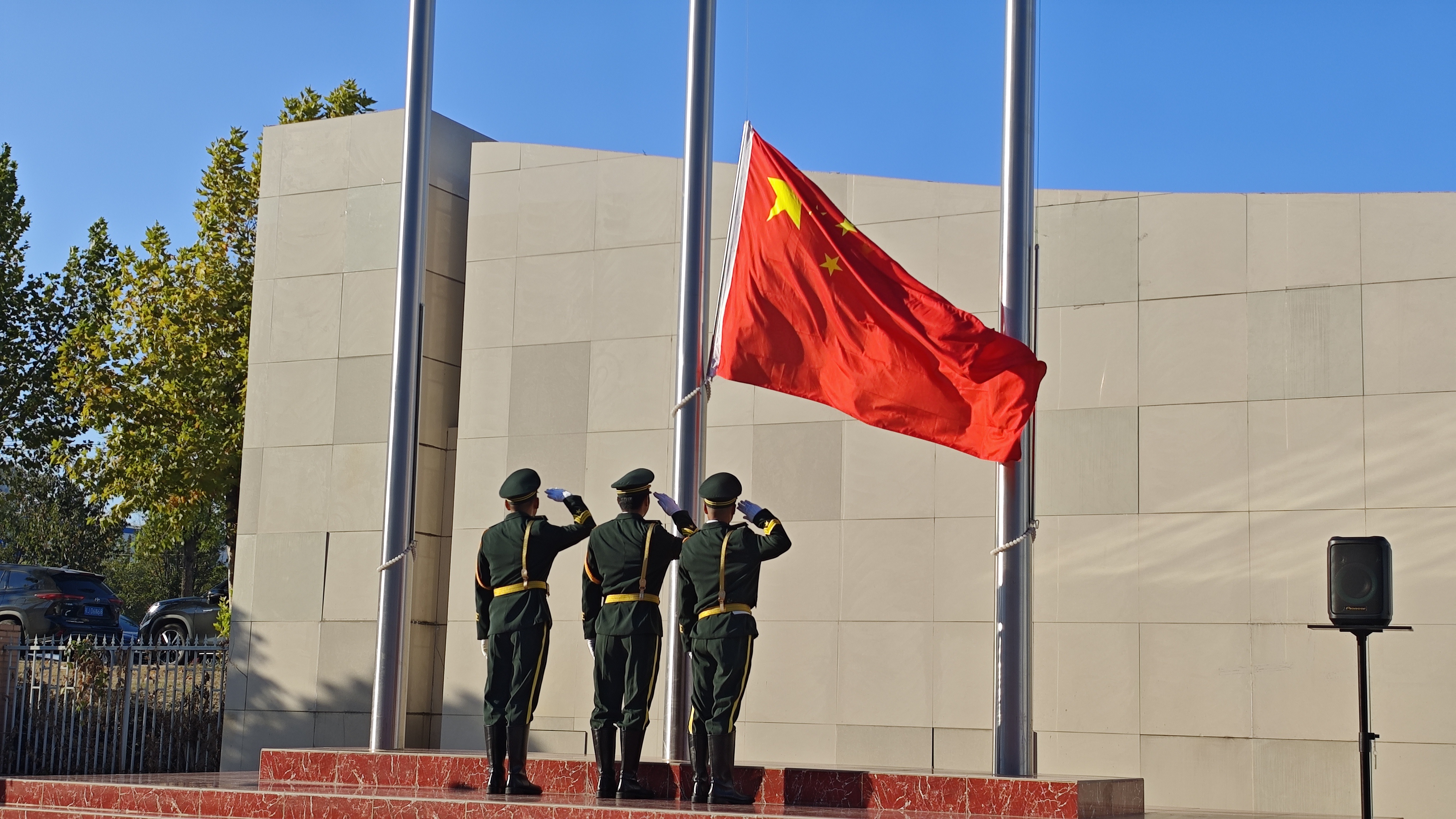 伴随着《义勇军进行曲》雄壮嘹亮的旋律,旗手振臂扬旗,五星红旗冉冉升起、迎风招展。