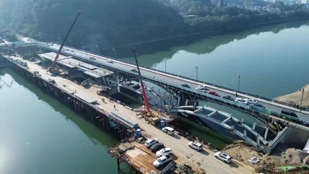 东岳大桥位于江西省上饶市信州区,复线桥工程位于原桥上游,全长约218.82m,按老桥通航标准新建,建成后与老桥合用,成为上饶市城东地区重要的跨江通道。目前正在进行最后一跨吊装工作,预计1月合龙。