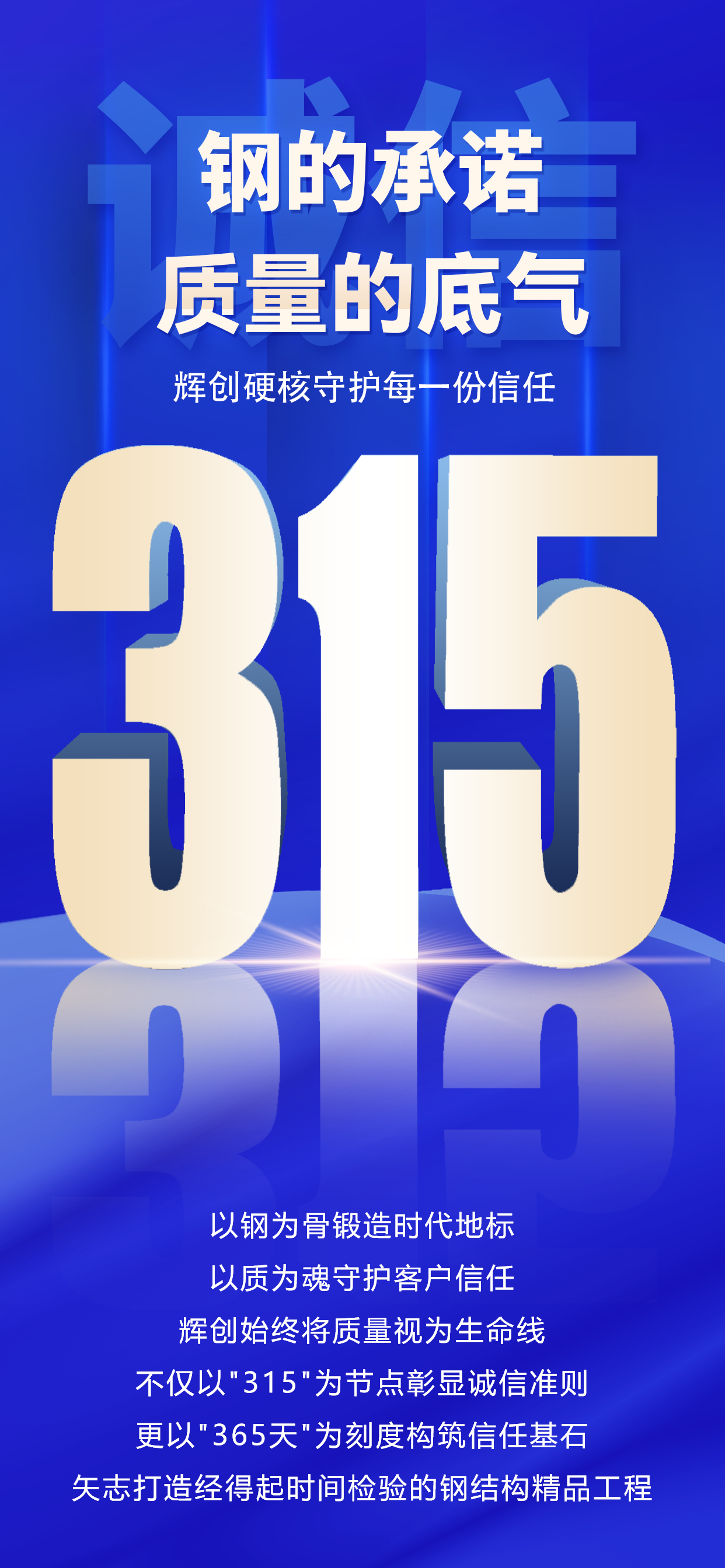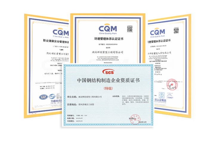 质量是辉创的立业之基,更是对客户庄严的承诺。作为行业质量标杆企业,辉创始终以超越行业标准的责任担当,将质量管控贯穿于生产服务全周期。公司依托国家钢结构特级资质、三体系认证、安全生产许可等完备资质体系,用看得见的证书体系和看不见的匠心苛求,构筑起覆盖设计、施工、验收全链条的品质保障壁垒。
