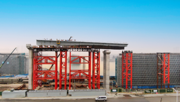 ✦将长45米的超大叠合梁一分为三,运输至现场进行二次拼装,再采用两台500吨汽车吊双机抬吊的方式,一次吊装到位;